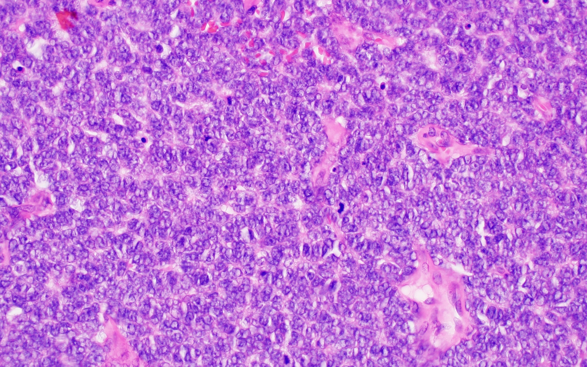 Histology from the resection reveals sheets of monomorphic tumor cells with high nuclear to cytoplasmic ratio, clumpy chromatin, frequent apoptotic bodies, and numerous mitotic figures. In other areas, the tumor shows necrosis and infiltration of the dura.