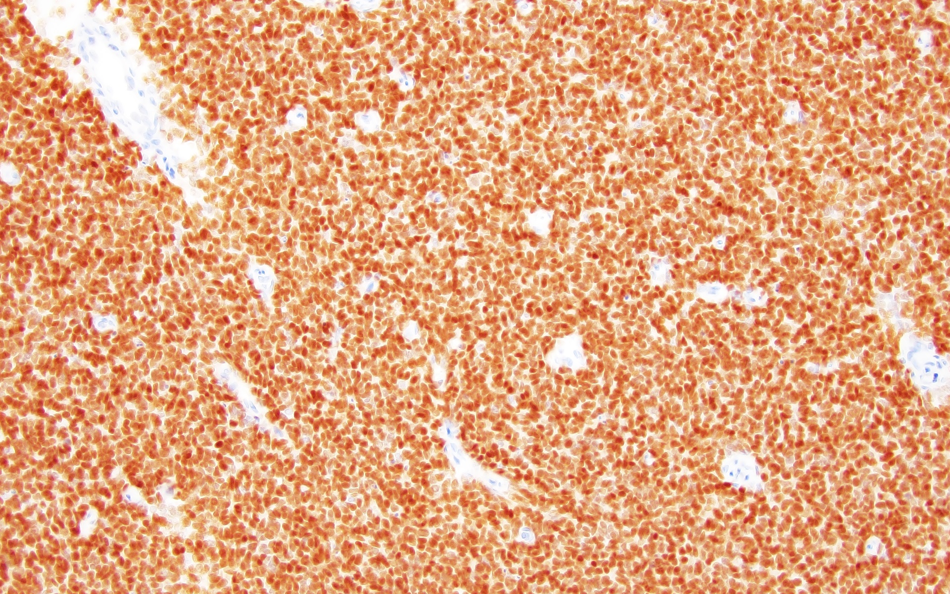 Title: 5-year-old with headache and vomiting Author: Jared T. Ahrendsen, MD, PhD Institution: Northwestern University Feinberg School of Medicine Clinical History: A 5-year-old child presents with acutely worsening headache, vomiting, and weakness. The child has no prior medical or family history. Radiology: Magnetic resonance imaging (MRI) demonstrates a large, irregular, variably enhancing mass involving the left frontal lobe with significant mass effect and probable dural involvement. Computed tomography (CT) of the chest, abdomen, and pelvis is negative for extracranial disease. Representative Histology / IHC: