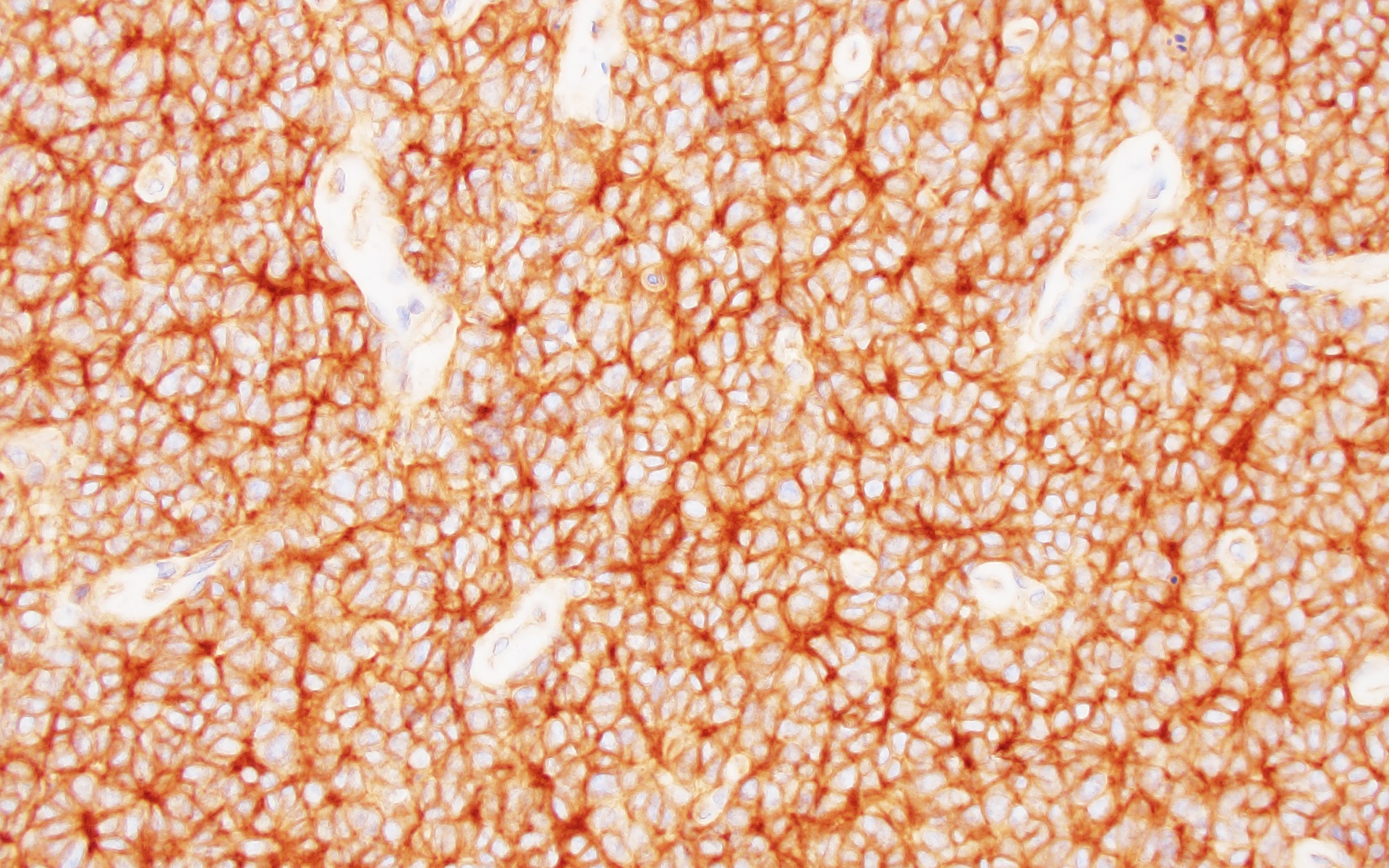 By immunohistochemistry, the tumor cells are diffusely positive for CD99 (membranous) and Nkx2.2 (nuclear). Tumor cells show retained nuclear expression of INI1, BRG1, and H3K27me3. The tumor cells are negative for GFAP, Olig2, synaptophysin, BCOR, desmin, and myogenin. Questions for Viewers: 1) Based on the histomorphology, what is the differential diagnosis for this lesion? 2) What immunohistochemical stains would help with the differential diagnosis? Based on the immunohistochemical staining results, how would you refine your differential diagnosis? 3) What is the likely molecular alteration found in this lesion? |